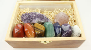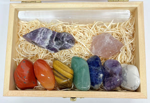 This kit includes a wooden box with 7 Extra-Large Polished Chakra Tumbled Stones, an amethyst druze or a rough chrevon amethyst, a rough rose quartz crystal, and a 14 cm selenite flat bar. The Chakra Stones Included Are The Following: Red Jasper, Carnelian Banded, Tigereye Gold, Aventurine Green, Soladite, Amethyst, and Howlite.